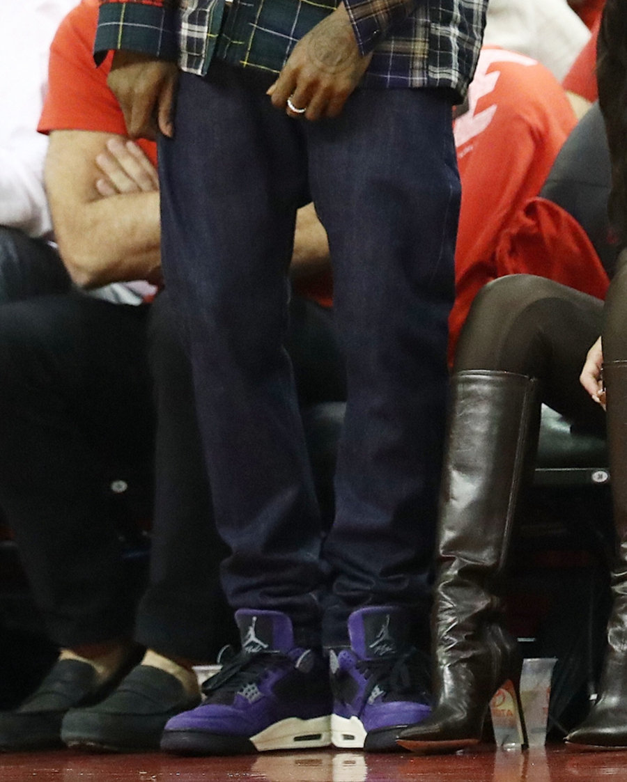 今天的抢七大战,Travis Scott 上脚一双从未见过的紫色 Air Jordan 4 场边观战。 可以看出鞋面由紫色麂皮打造,中底为白色,以黑色和灰色点缀。与此前的曝光的联名款同为麂皮材质,看来 Travis Scott 对麂皮钟爱有加。是新一款联名配色还是仅仅是一款普通 AJ4 新品,目前不得而知。 目前尚无更多信息,我们将持续关注并第一时间带来报道。 pic via:brkicks
