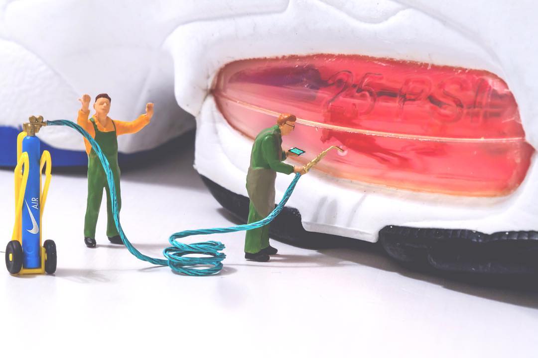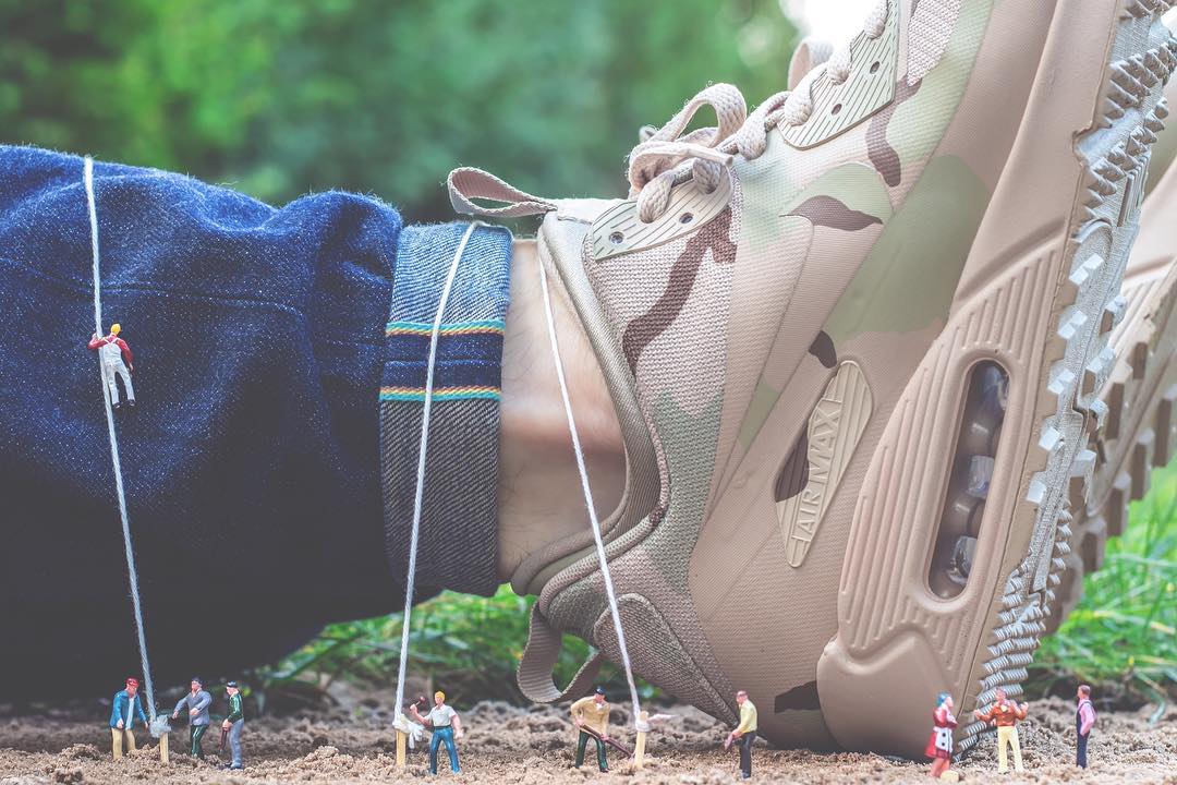 将微观人偶与球鞋搭配,夸张的比例营造出现实中的生动场景,无缝衔接的创意表现,好比球鞋版的 “进击の巨人”,绝对让人过目不忘。
