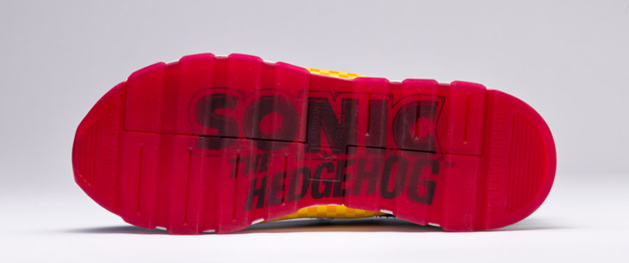 索尼克配色以毛绒质感的蓝色麂皮打造,让人不禁想起索尼克的蓝色毛皮,绿色和黄色点缀还原游戏中的草地场景场景,红色外底象征索尼克的红色鞋子。后跟内侧烫印有游戏中的金环图案和索尼克头像。