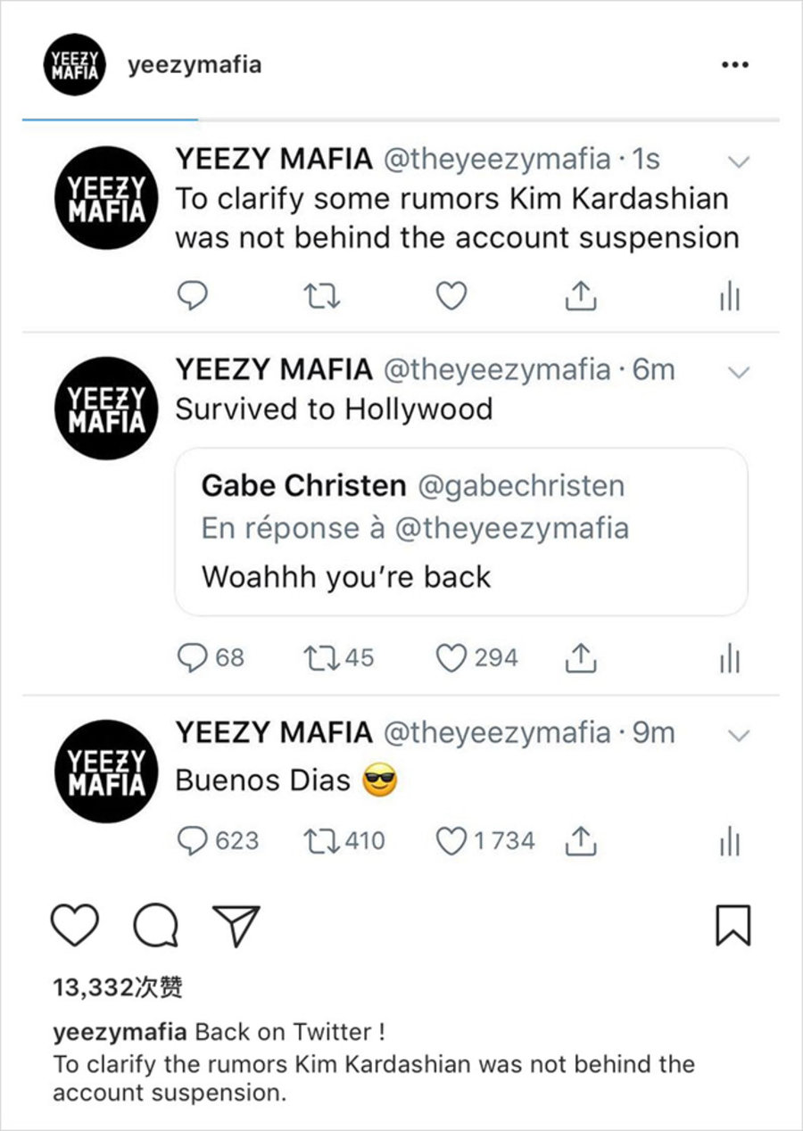 但日前,YEEZY MAFIA 的 Twitter 账号突然解封,并主动表示了卡戴珊并不是导致账号被冻结的幕后黑手。