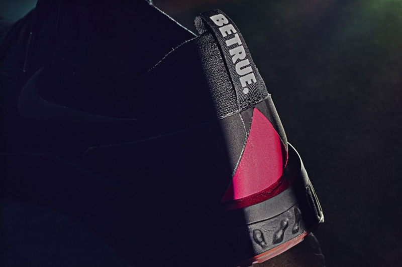 鞋款整体以黑色为主调,后跟处的粉色三角、“BETRUE” 字样与外底的彩虹水晶底都彰显出这双鞋的 LGBT 主题,与整体的黑色产生极大的视觉反差,在低调中更突出亮点与主题。