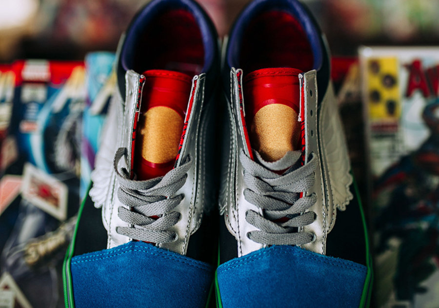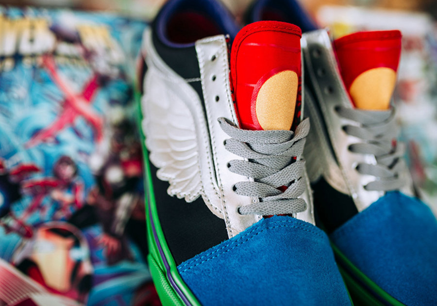 目前有三款鞋型曝光,一款为 “What The” 风格 Old Skool,融入四位早期复仇者元素,红色鞋舌和金色圆形图案象征钢铁侠,鞋面银色翅膀代表雷神托尔,后跟为美国队长盾上的图案,绿色的鞋底则是来自绿巨人。