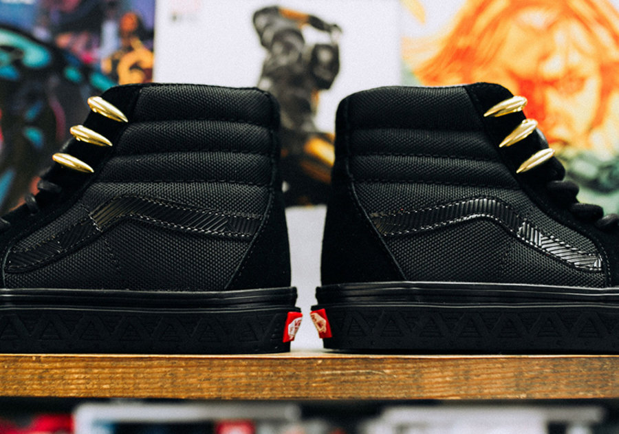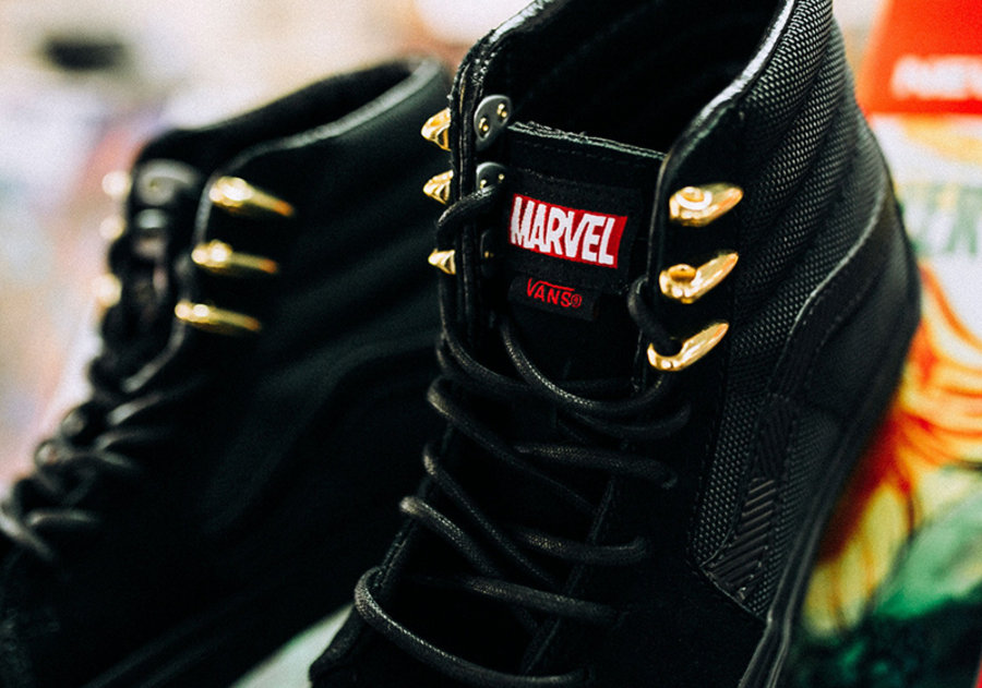 另外两款分别为黑豹和蜘蛛侠主题,Sk8-Hi 模仿黑豹的战衣质感,Slip-On 则是印有蜘蛛侠的漫画形象。