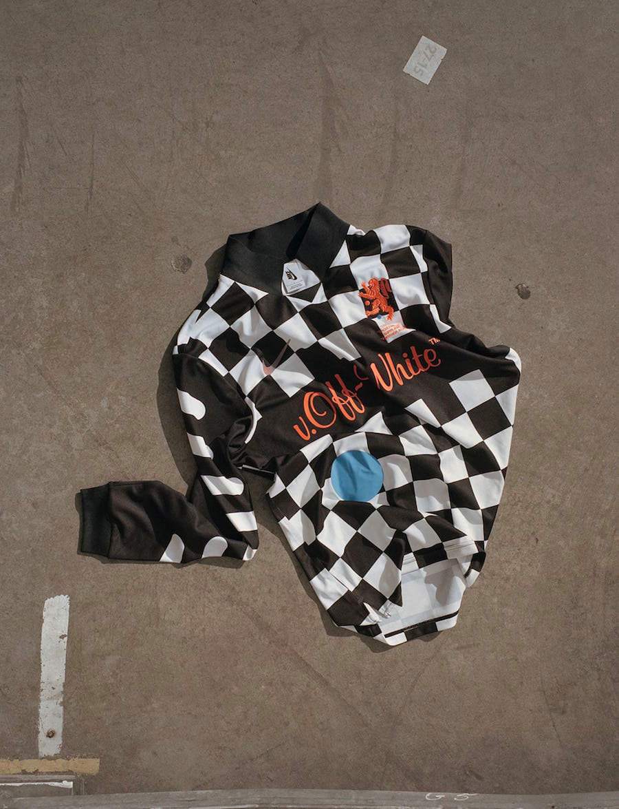 灵感源自足球场,同时也融合了 Virgil Abloh 在儿时对于球鞋的美好记忆,将传统球衣重新剪裁,呈现了更为时尚的轻盈感受。