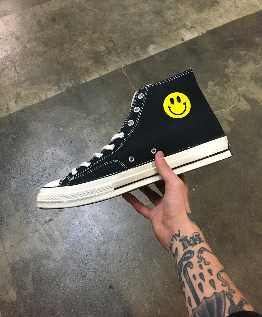 这双 Converse 不仅在外侧带有黑色的 Swoosh,内侧的笑脸 LOGO 则是品牌标志。