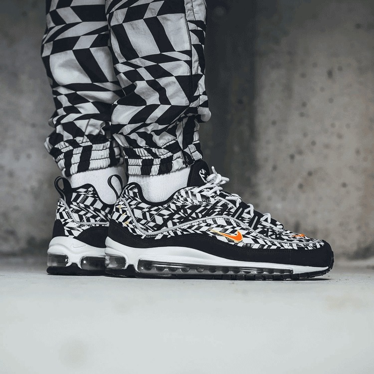 AOP = All-Over Print,这双 Air Max 98 以独特的黑白迷彩纹理全面覆盖,Nike 还打造了同主题的服装。