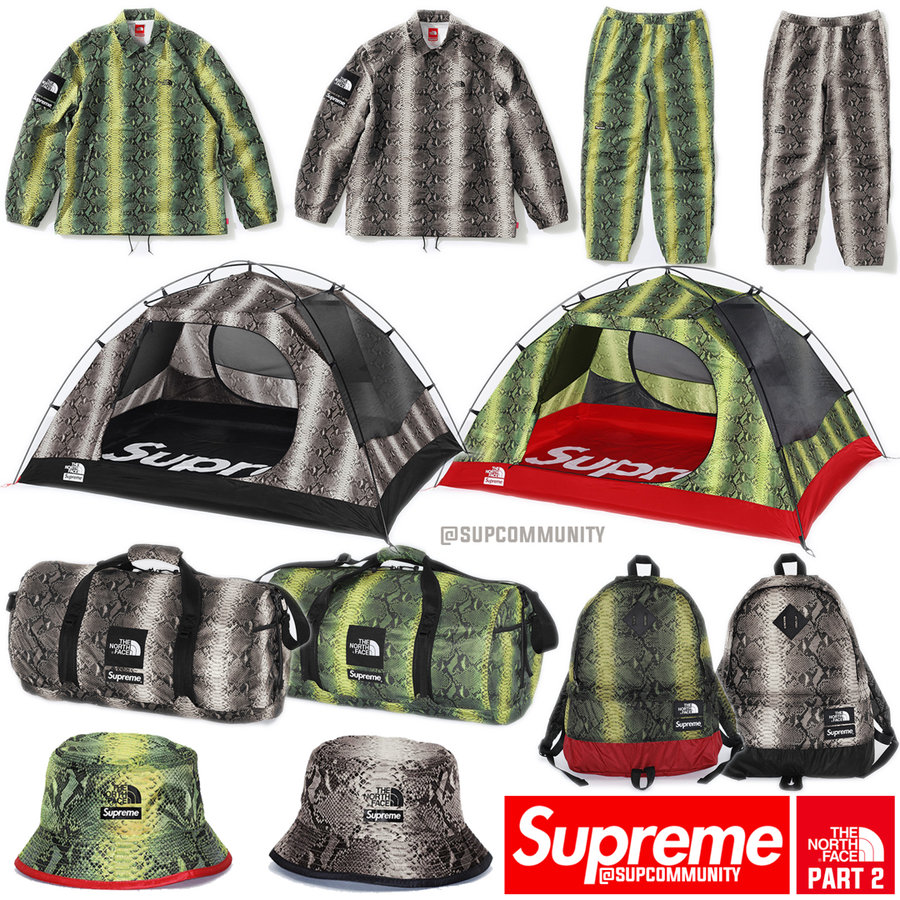 Supreme x THE NORTH FACE 2018 春季第二辑联名系列终于正式发布。第二辑主打蛇纹印花,除了之前曝光的黄/绿配色之外还有灰褐色选择;单品包括教练夹克、长裤、两面戴可收纳 Crusher 帽、旅行包、背包以及最重磅的 Stormbreak 3 帐篷。据悉 Supreme x THE NORTH FACE 2018 春季系列第二波将于 6 月 7 日上架纽约、布鲁克林、洛杉矶、伦敦、巴黎门店以及线上商城,并在稍晚些的 6 月 9 日登陆日本。具体的单品售价如下: