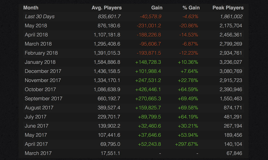 根据 SteamCharts 的统计数据显示,“吃鸡游戏” 自从今年 1 月份开始,玩家数一直在持续减少。如今已经到了 186 万,完全无法与年初 323 万的相比;平均在线玩家也从 158 万跌至 84 万。那么问题来了,人们在摒弃 “吃鸡” 后,都去玩了什么游戏呢?