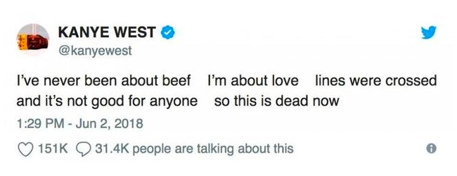 Kanye West、Pusha T 和 Drake 都是 adidas 的合作者,所以侃爷也发推表示,这一次的撕逼已经突破了底线,对谁都没有好说,到此为止吧!