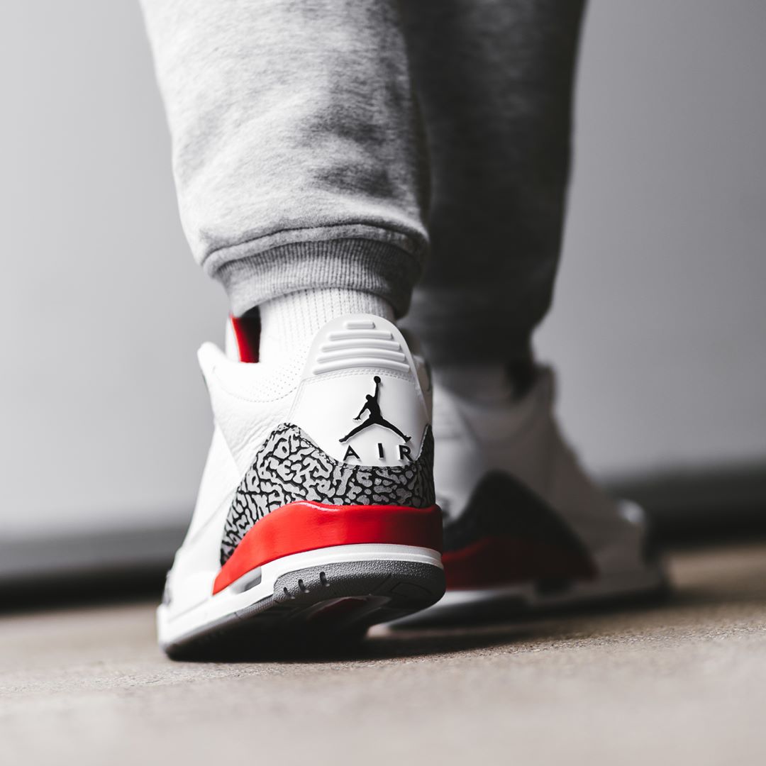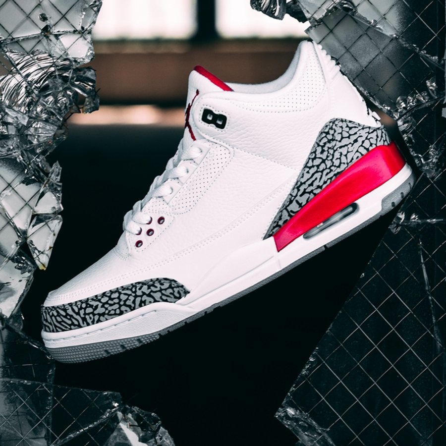 曾经仅在拍卖会上出现的稀有配色带回,Air Jordan 3 “Katrina” 将鲜红点缀到经典的白水泥主题中,上脚效果极为出众。