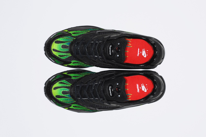 带来一黑一白两款配色,迎合当下极具人气的 “老爹鞋” 风潮,以纯正的 Old-School 感受带来动感的视觉效果。 从鞋头延伸到鞋帮的火焰装扮颇具辨识度,鞋舌 Supreme Logo 同样抢眼,直接表明了它的身份。