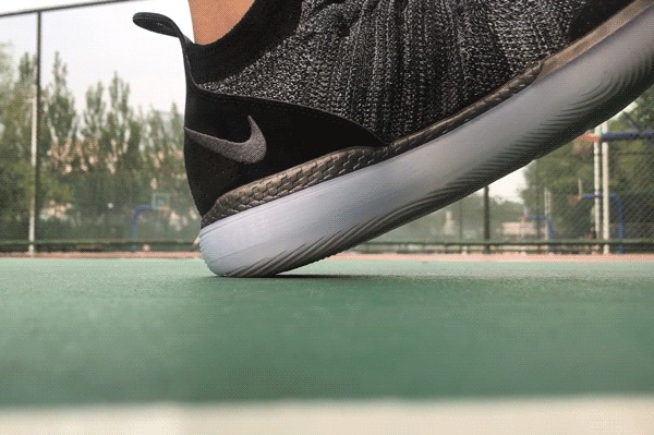 在首次穿着下地时,因为 Zoom Air 气垫贴近于脚底,可以轻易感觉的下陷的感觉,而在踩踏后跟时,也可以清晰的看到一部分裸露在外的 Nike React 形变。