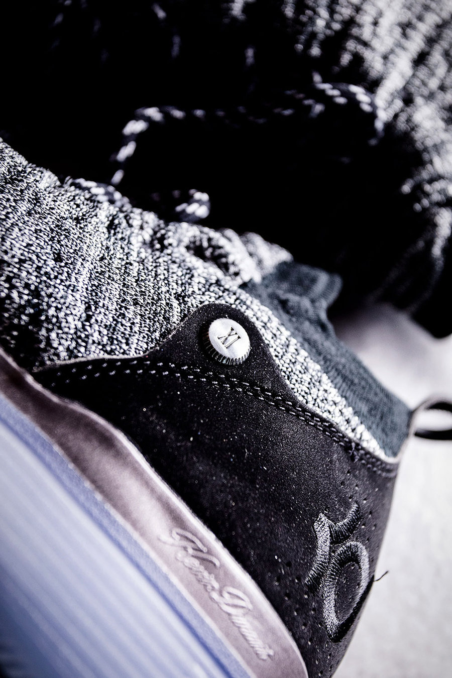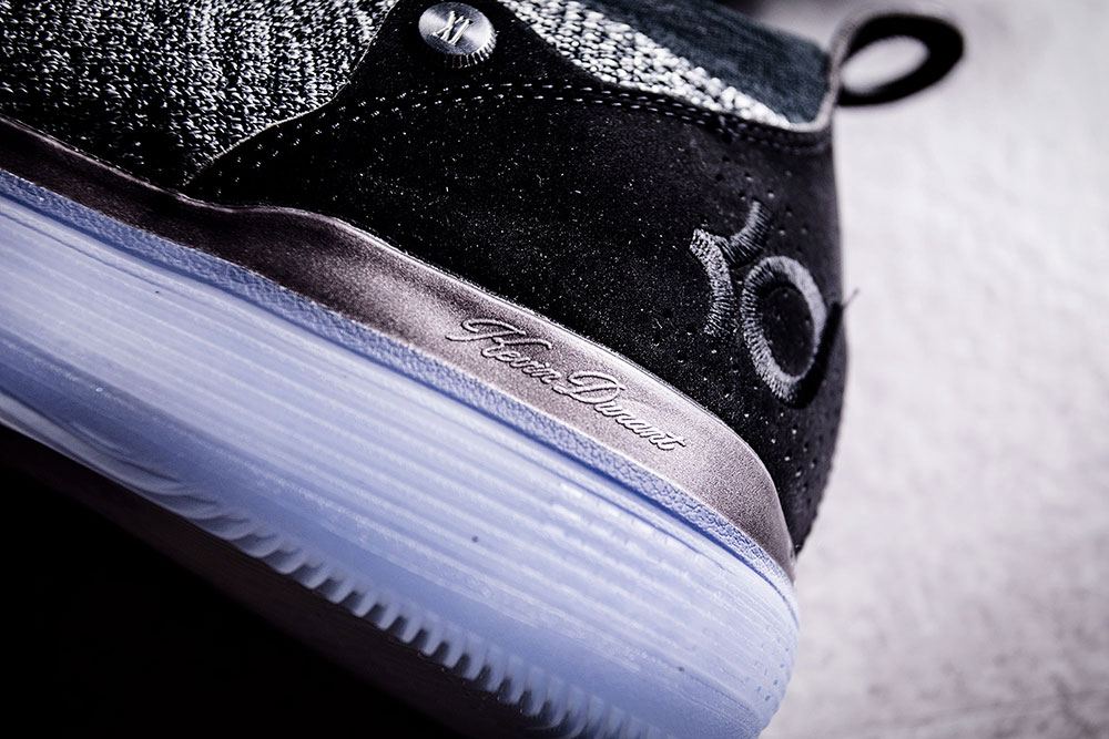 小编收到的是黑白首发配色 KD11 Still KD,鞋身采用黑白灰三色编织而成的中帮袜套式鞋面,后跟选用麂皮材质打造而成,并绣有 KD Logo,除此之外周围还有冲孔细节,将冲孔连接起来分别是数字 “35” 和 Nike Swoosh。
