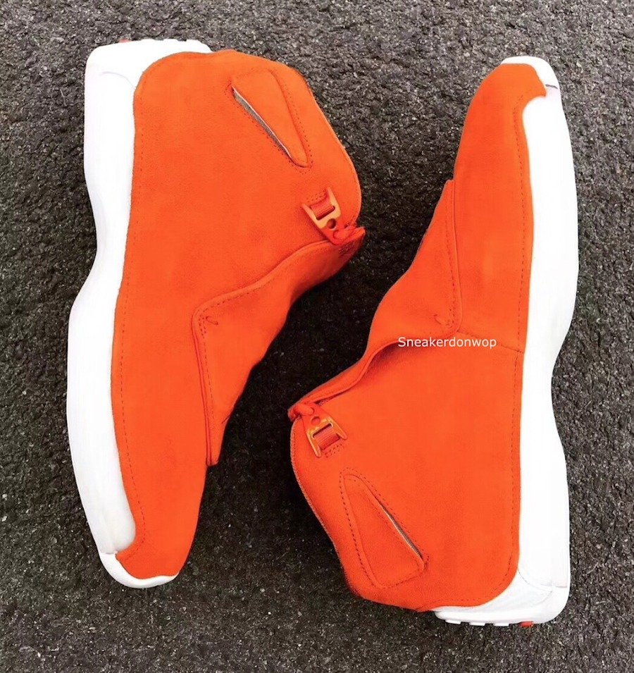 本周 Air Jordan 18 的新品频繁曝光,除了元年的黑蓝配色将在今年复刻之外,昨天还曝出了一双纯灰色版本,今天又一双橙色的 Air Jordan 18 “Orange” 曝出实物图。 鞋款整体以亮眼的橙色为主调,鞋面使用材质麂皮打造,搭配白色中底与外底,相比其他配色高调张扬了许多,双层 Zoom 气垫与双层碳板的超豪华组合更是带来不错的上脚感受。 该配色目前尚未公布具体发售信息,我们还将持续关注并带来相关报道! Pic via:sneakerdonwop