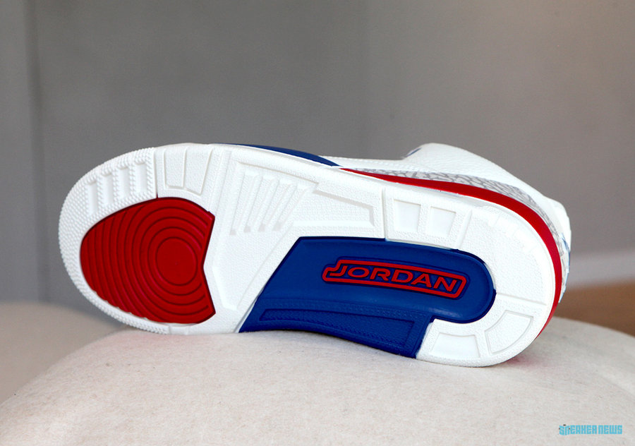 眼前这双 Air Jordan 3 “International Flight” 以 1988 年 MJ 参加的一场慈善赛为主题,以白色鞋身呈现灰色的爆裂纹装饰,细节的蓝红点缀则来源于当晚 MJ 所穿着的球衣配色。