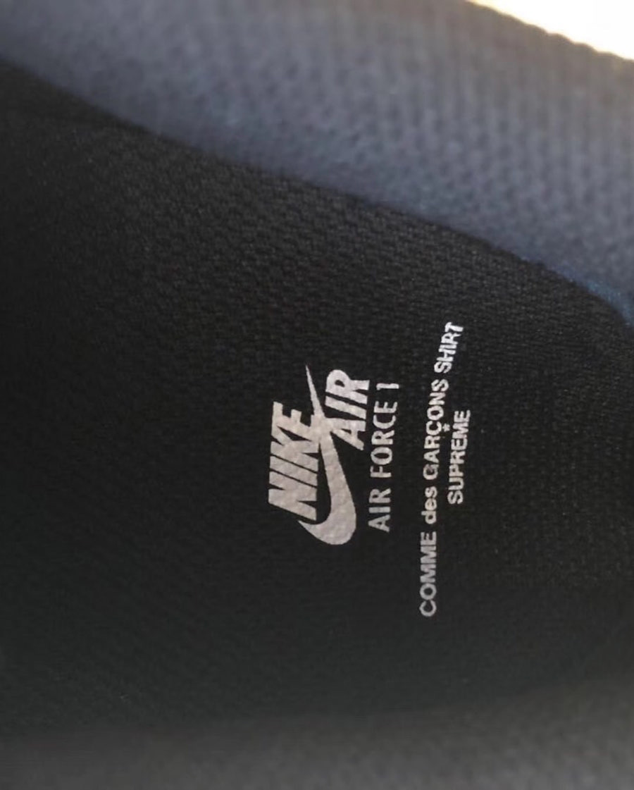 今天迎来实物的首次曝光,在一双黑色低帮 Air Force 1 Low 的基础上,不仅在鞋垫和后跟呈现了 Supreme 和 Comme des Garçons 的名称,断钩设计的 Swoosh 则是最大的亮点所在。