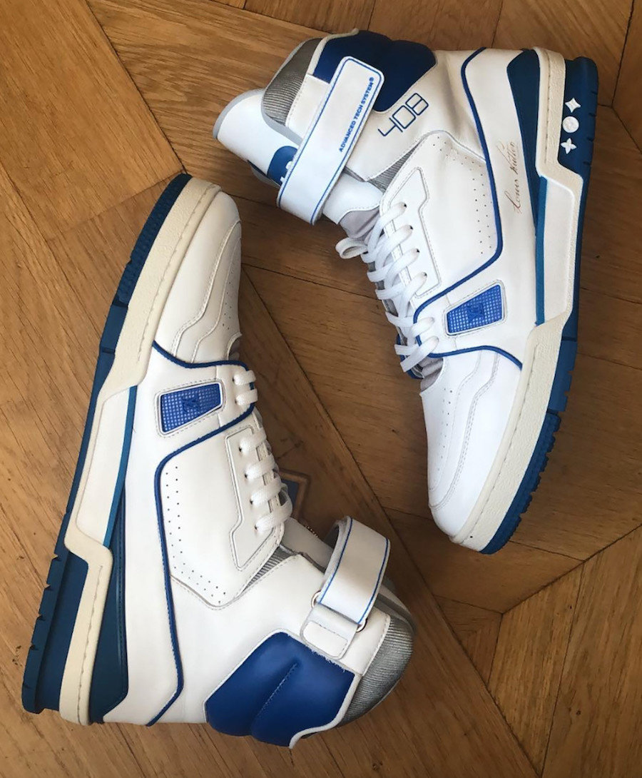 鞋款采用高帮鞋型,整体有一种复古篮球鞋的感觉,除了黑灰配色之外,还有白红与白蓝两款配色,在设计上鞋身有醒目的 “408” 数字,绑带设计增添细节,在整双鞋中有非常丰富的 LV 经典元素。