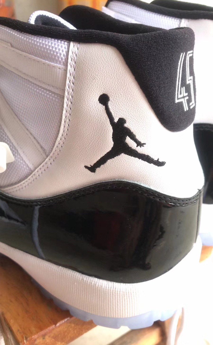 后跟以 MJ 的 45 号背号呈现,这也是曾经乔帮主穿过的 PE 未市售版本的后跟编号。