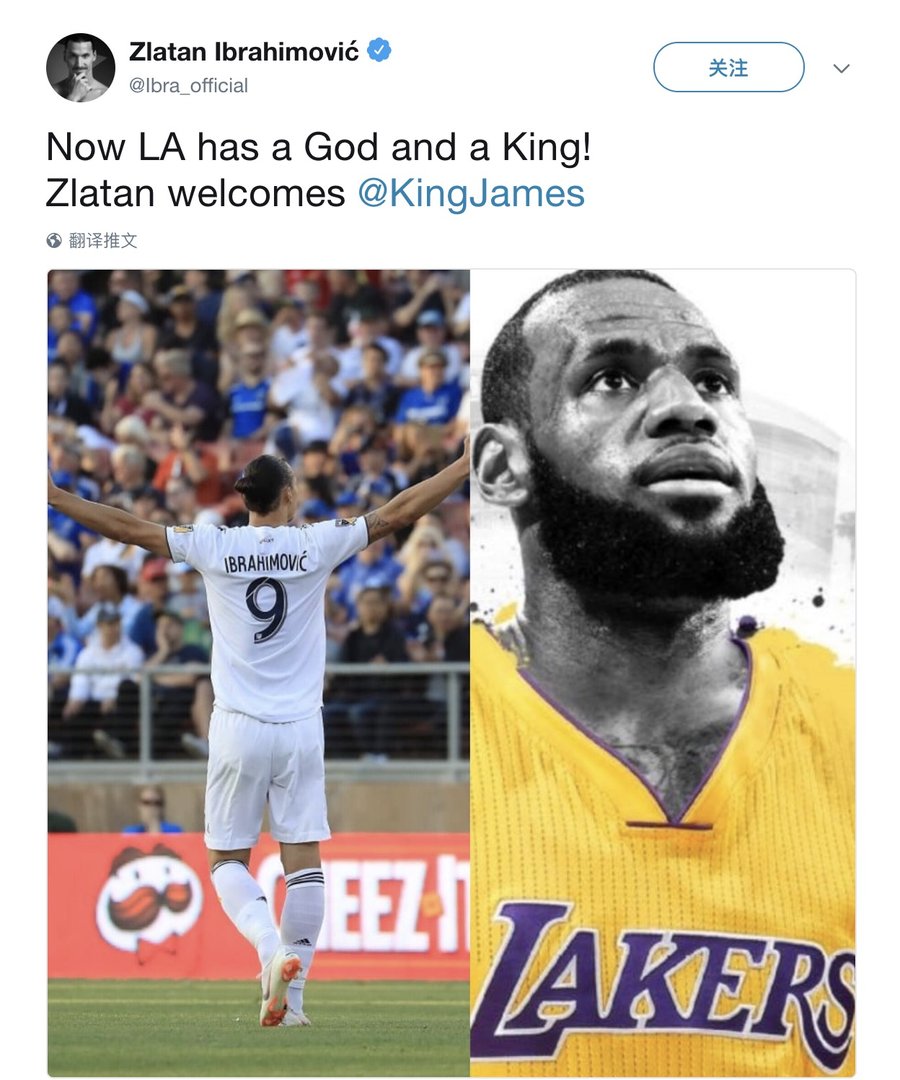 同样来到洛杉矶的瑞典球星伊布拉希莫维奇表示:“洛杉矶现已有一个上帝和一位国王!”