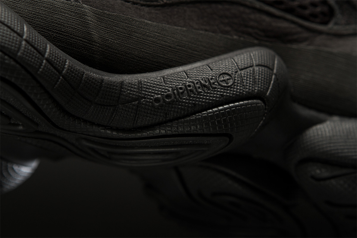 从鞋底到鞋身都采用黑色贯穿,不同材质纹理呈现丰富层次。承袭天足的经典设计,跨越复古与科幻的视觉效果,迎合当下老爹鞋风潮,在街头上脚确实具有不俗的吸睛效果!