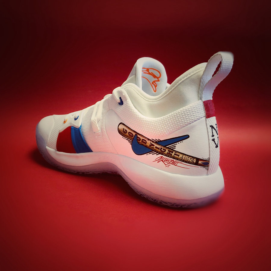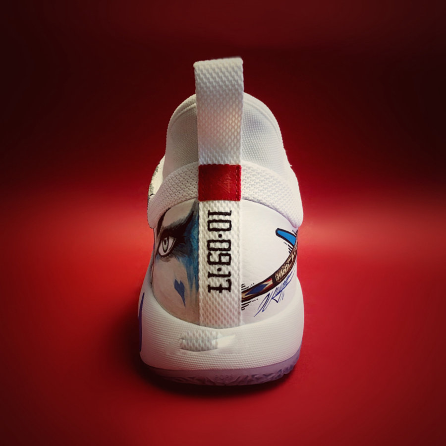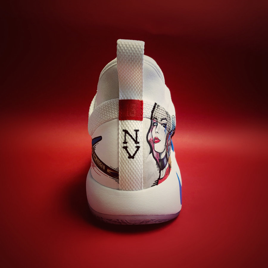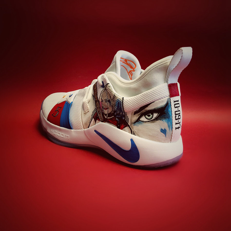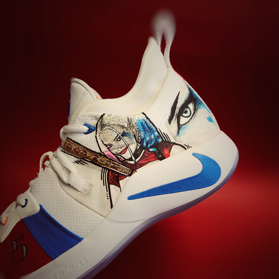 超级英雄漫画主题定制层出不穷,近日定制单位 Melonkicks 打造了一款小丑女哈莉·奎茵主题的定制版 PG2。 以白色为主色调,点缀红蓝两色,与 《自杀小队》 电影中小丑女的肤色和服装配色相同。鞋面绘有小丑女形象及妆容,画工精湛还原度极高。 ▼《自杀小队》 电影版小丑女形象 鞋面内侧棒球棍与 Swoosh Logo 的互动更是神来之笔,打破次元壁。