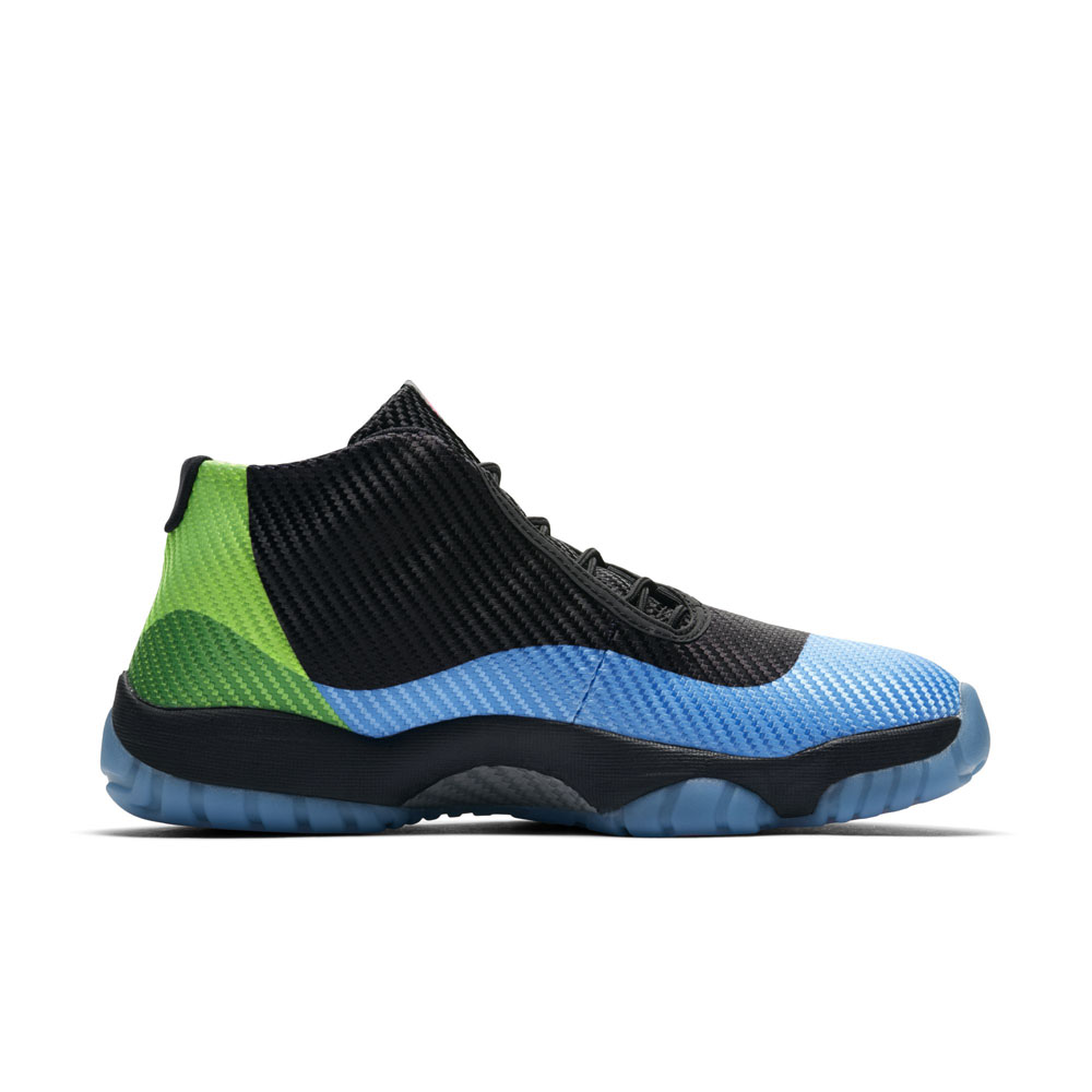 鞋款整体以黑色为主调,黑色的编织鞋面上点缀大面积的蓝色、粉色和绿色,涂色的轮廓与 Air Jordan 11 的漆皮设计非常相似,整双鞋亮眼的细节设计在于水晶外底竟然是夜光材质,鞋面上也加入 3M 反光材质点缀,不论在白天黑夜都是焦点。