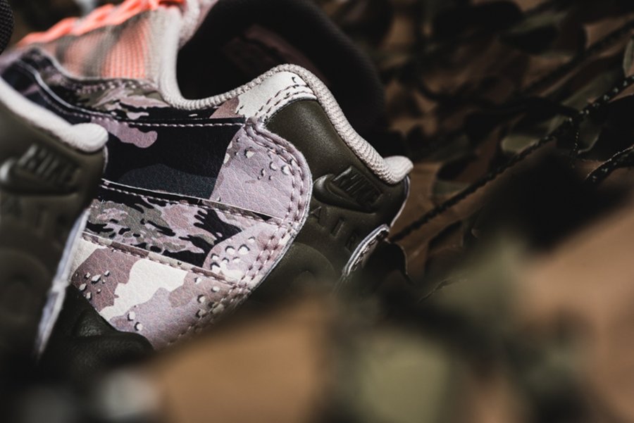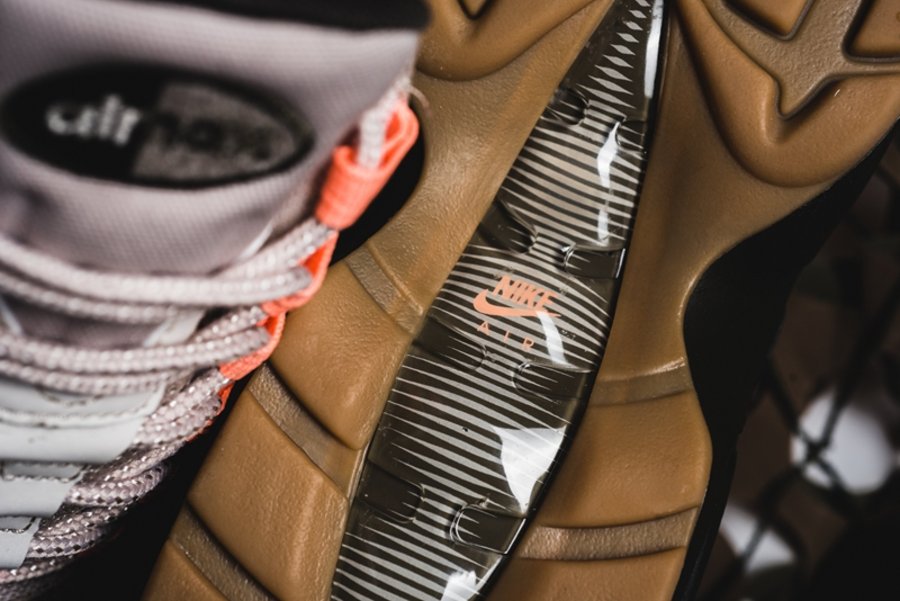 卡其色的鞋身辅以沙漠迷彩配色的波浪设计,使鞋子的机能感大大增强。鞋带扣、Swoosh Logo 和缓震内柱以暖橙色点缀,像在沙漠上的落日,整体设计语言非常鲜明。