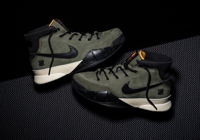 近日,洛杉矶传奇球星科比提前上脚这双橄榄绿配色的 UNDEFEATED x Nike Kobe 1。