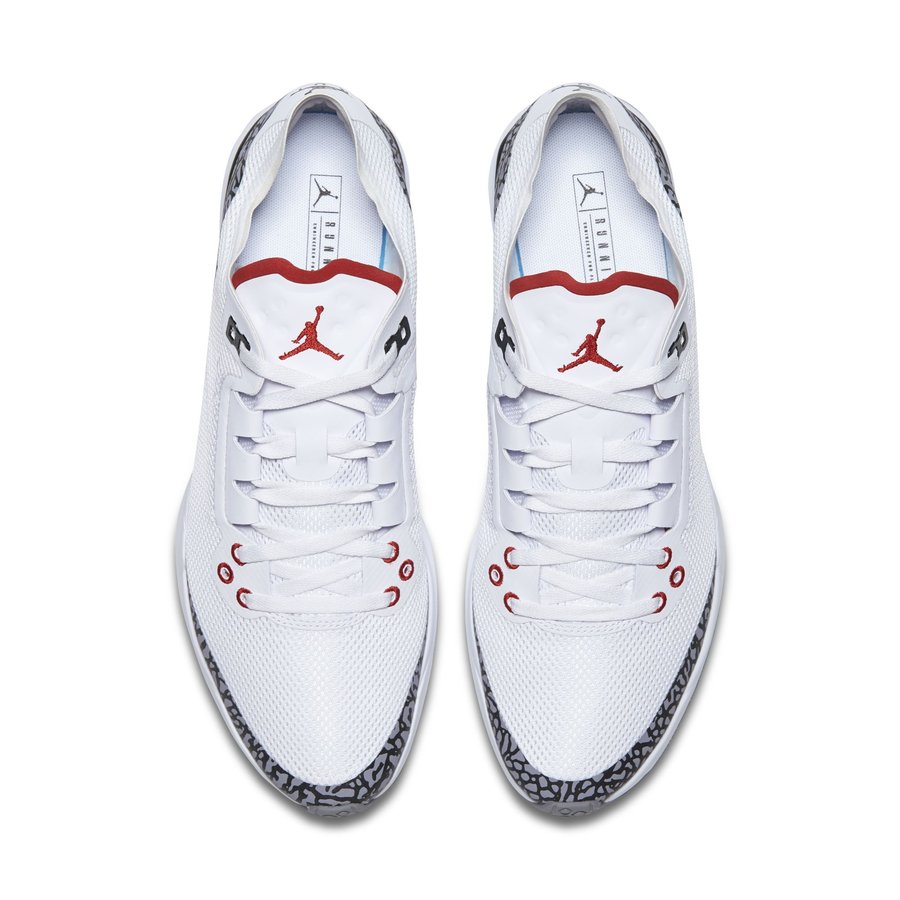 在 Flyknit Racer 的经典鞋底基础上,以轻量织物面料再造鞋身,细节则融入了诸多 Air Jordan 3 白水泥的经典设计。