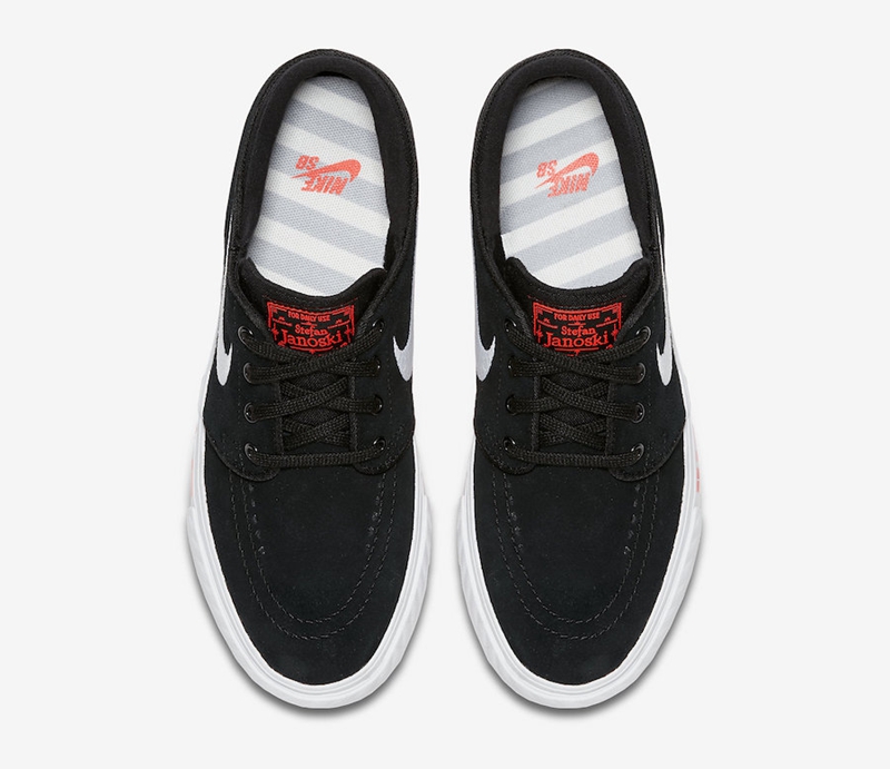 这款 Nike SB Stefan Janoski 黑色的鞋身上面有白色的刺绣 Swoosh Logo,搭配鞋舌处标志性的红色 Logo;并在中底上以红色字体突出这款鞋的口号:“Just Do It”,与醒目的红色外底相得益彰,为鞋款本身带来活力。
