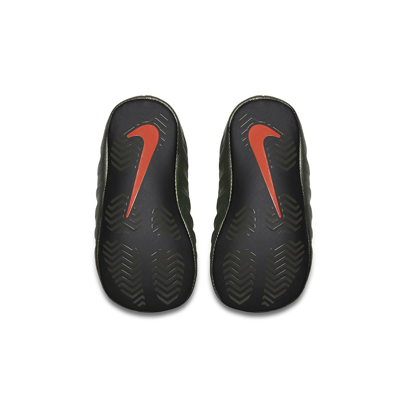 鞋款以军绿色为主调,发泡鞋面全部以军绿色覆盖,搭配黑色皮革鞋领与黑色外底,鞋底 Logo、鞋带头等细节以橙色点缀,军绿和橙色的搭配不禁让人联想到 Undefeated 的经典配色!