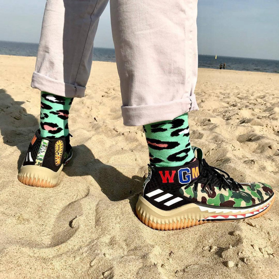 BAPE x Dame 4 的超重磅联名,融合了经典的迷彩和鲨鱼元素,绝对是今年最潮实战鞋。发售初期价格飞涨,但由于绿色版本过于独特搭配难度高,不适合日常穿着,目前价格已跌至 2000 元左右。目前市场价:2000 元左右