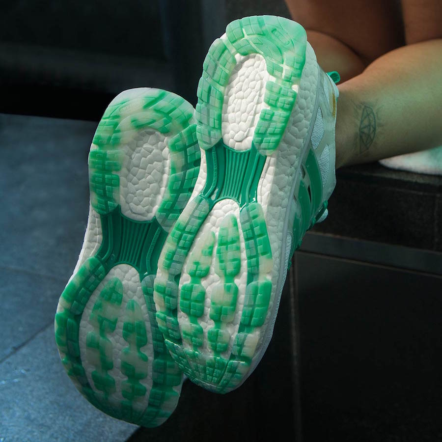 据了解此次 “Shiatsu” 系列主打鞋款为 Energy Boost 跑鞋,主体为白色,Logo、内衬、鞋带都以玉石绿色点缀,外底为绿色和白色相间的透明橡胶,颇具玉石质感。