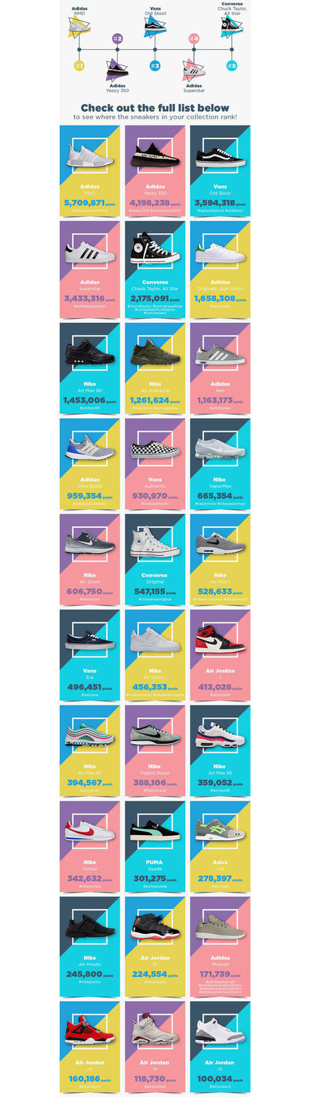 Instagram 可谓是全球球鞋爱好者聚集地,而近日 @forward2me 便通过 Hashtag 标签统计出了 Instagram 上最受欢迎的球鞋。从结果图中可以看出,NMD 和 YEEZY BOOST 350 拥有极高的人气值,而 Vans 则紧跟其后。反而 Nike 鞋款却出现了人气不足情况,这一数据统计不知道各位小伙伴们是否也有同感呢?