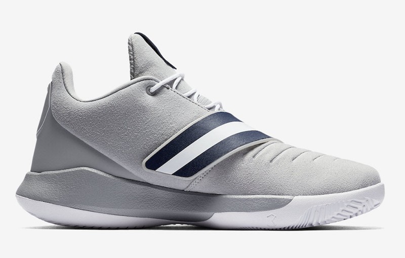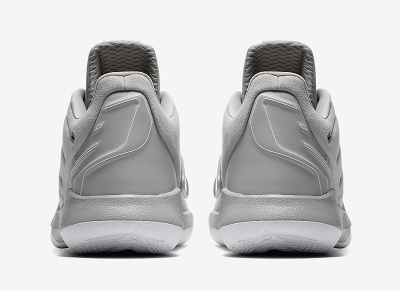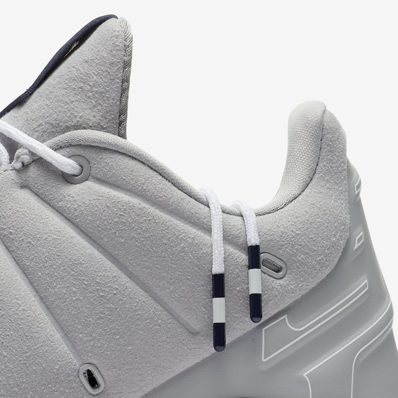 鞋款整体完美再现达拉斯牛仔队 Logo 配色方案。鞋身采用灰色麂皮打造,提供包裹稳定支撑的蓝白相间条纹绑带异常醒目,旨在致敬牛仔队标志性的蓝白五角星。