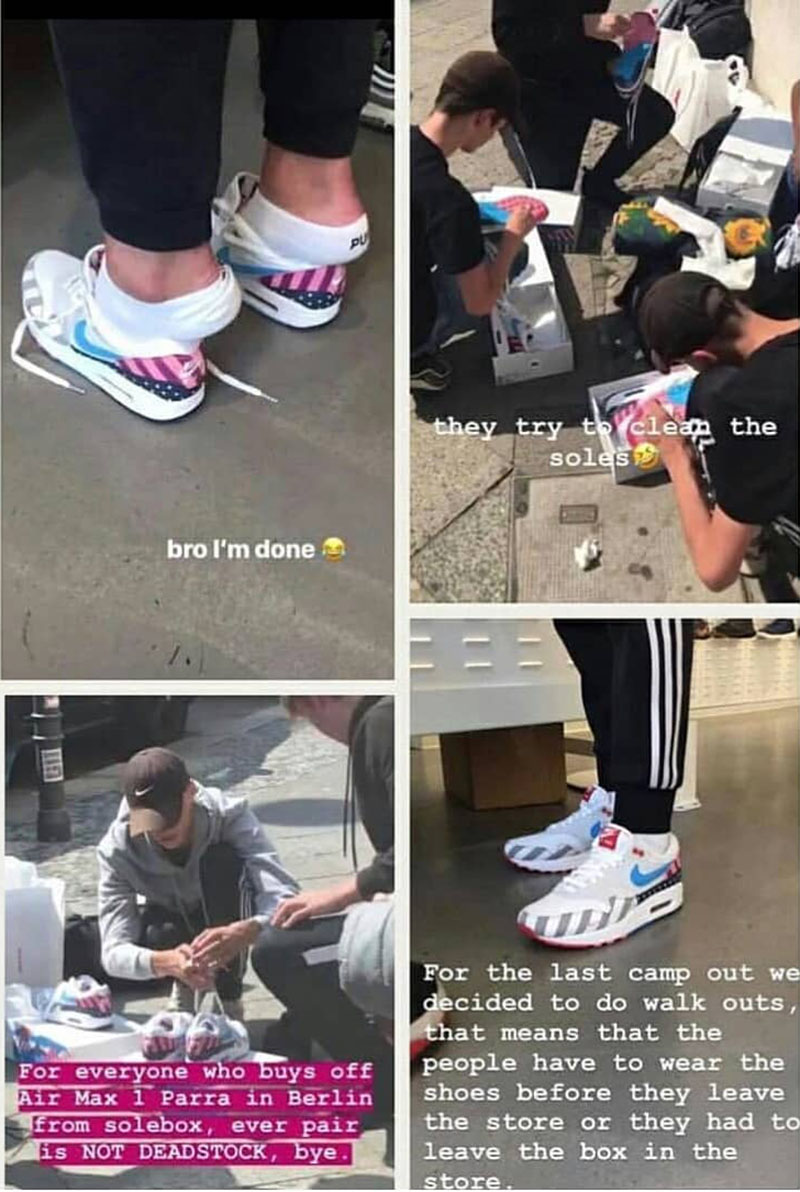 发售后 Solebox 店铺方在 Instagram 上发表:“在这次发售中,我们要求买家必须在离店时上脚鞋款,但是你没办法阻止这些商人,他们出门后就开始清洗鞋底。” 同时在图片配字调侃道,所有来自柏林 Solebox 的 Air Max 1 Parra 都已不是 Deadstock 全新未试穿的了。