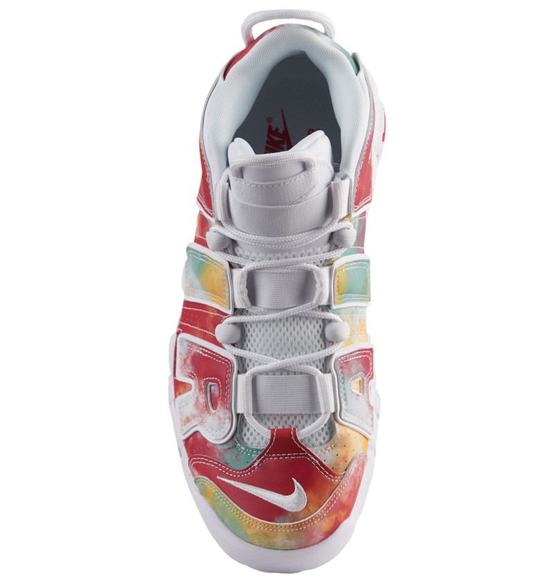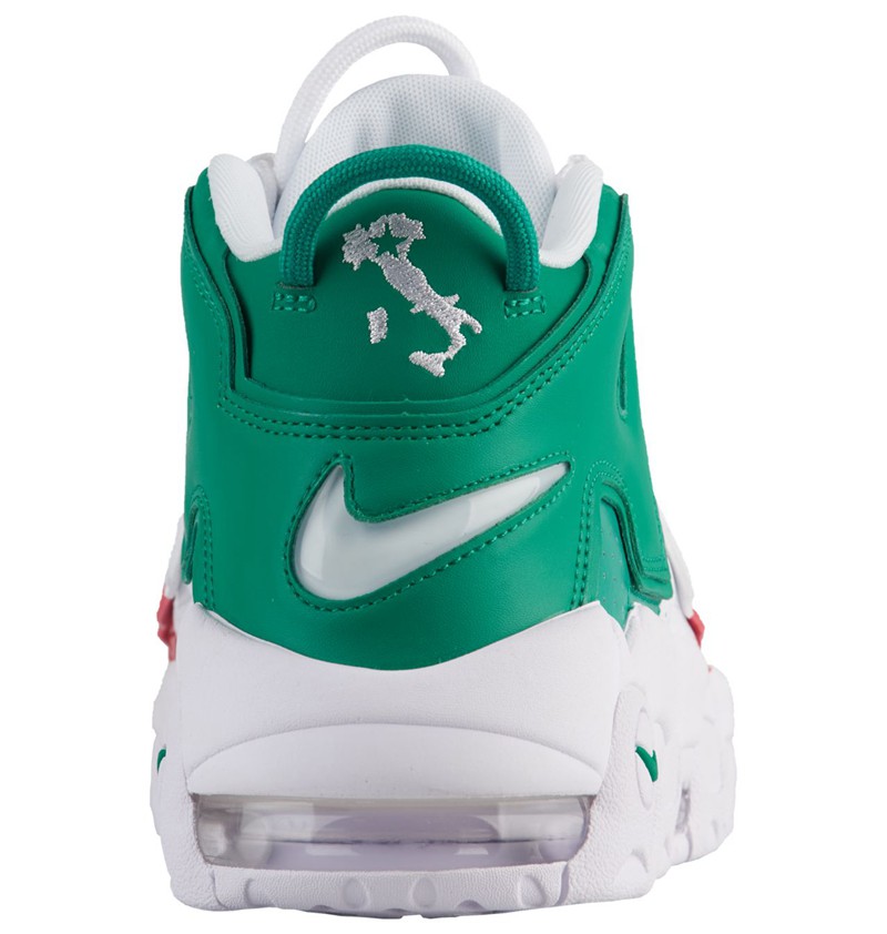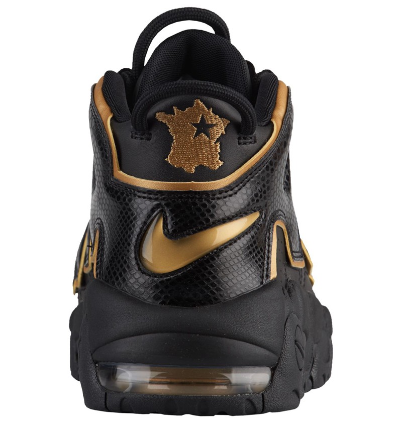 三款国家配色中,只有意大利的 Air More Uptempo 配色方案是以国旗的红白绿三色,而最新曝光的法国与神秘国家分别都采用了意想不到的配色方案。法国配色以黑金两色呈现,侧面 “AIR” Logo 采用爬虫类皮革材质。另一神秘国家则以红黄绿三色渲染鞋身,其余部分涂以白色,颇有艺术气息。