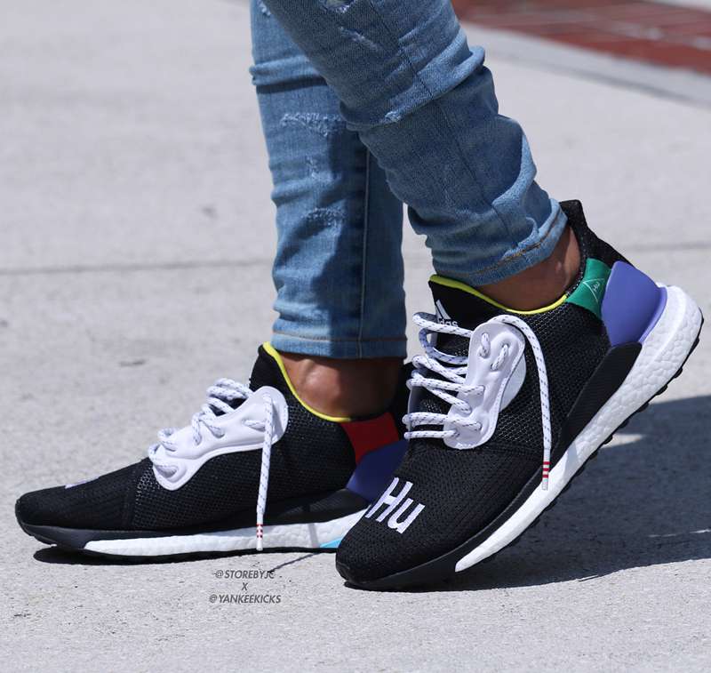 菲董早在 207 ComplexCon 就首次上脚曝光,即使采用了黑、白配色为主体,但依旧掩盖不了风骚的色彩运用,鞋身由黑、白为主色打造而成,而鞋跟处红、绿、紫三种颜色的碰撞搭配标志性的 “Hu” 可以说是非常亮眼!黄色的内衬在黑色的映衬下极为突出,白色的 Boost 中底有着跑车一般的腰线设计搭配湖蓝点缀,极具线条感,可谓是一双名副其实的 “菲董设计”。