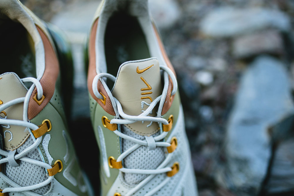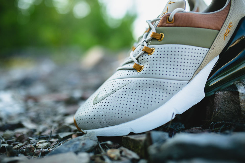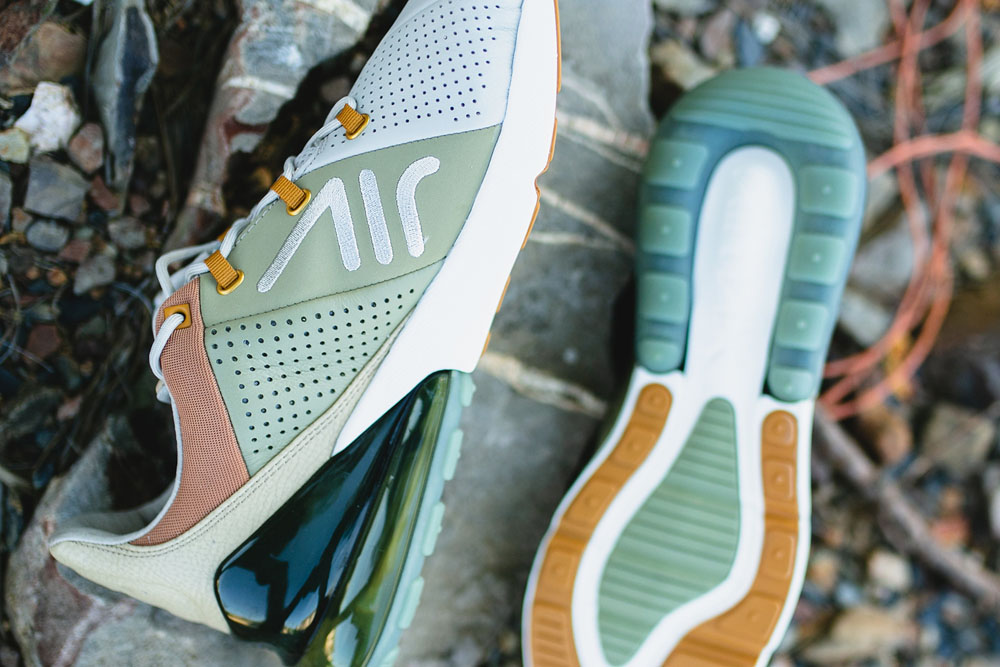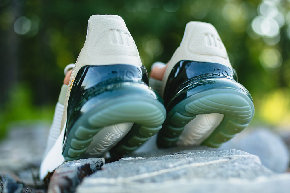 鞋款整体以浅色系为主,皮质面料首次出现在 Air Max 270 中,大面积的浅灰色搭配灰绿、姜黄与裸色,墨绿色的气垫后跟显得晶莹剔透。