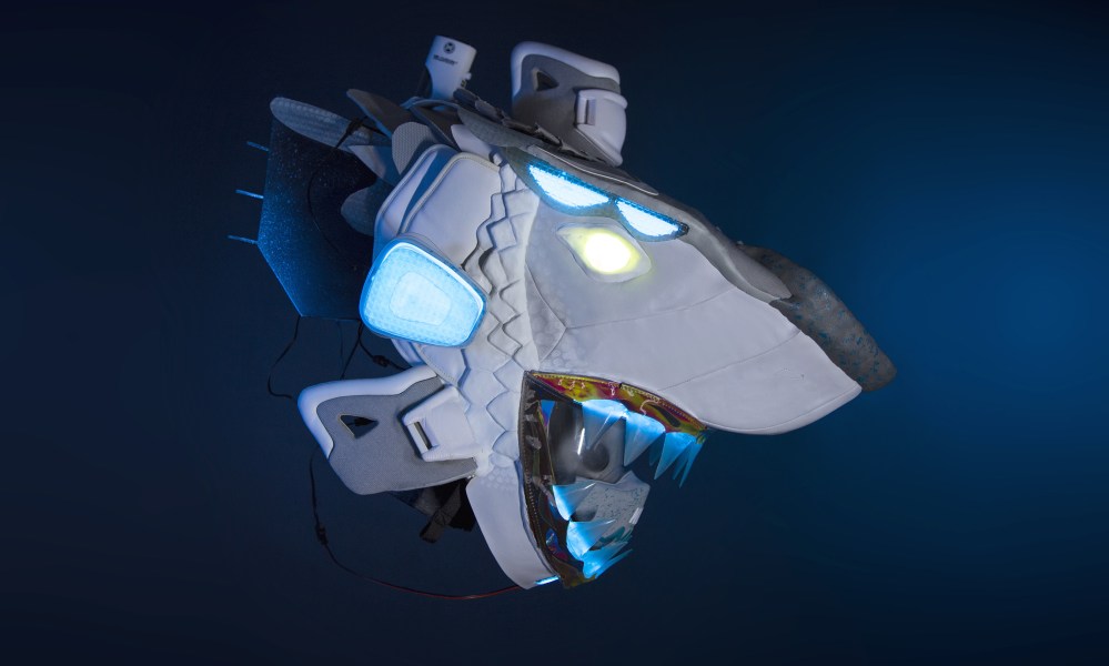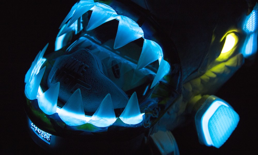 这位艺术家不仅打造一副精致的面罩,同时还为他拍摄了一组超级有感觉的型录,为此来特意找来一辆酷似 《回到未来》 中的汽车。照片中可以看到,这副鲨鱼面罩极为形象,将 Air Mag 完全解体后重组,醒目的 LED 等则分别点缀在眼睛、鱼鳃、牙齿等部位,更像是一个机械鲨鱼头,鞋的后跟被放置在鱼嘴中强调这件作品的身份,细节设计确实走心。