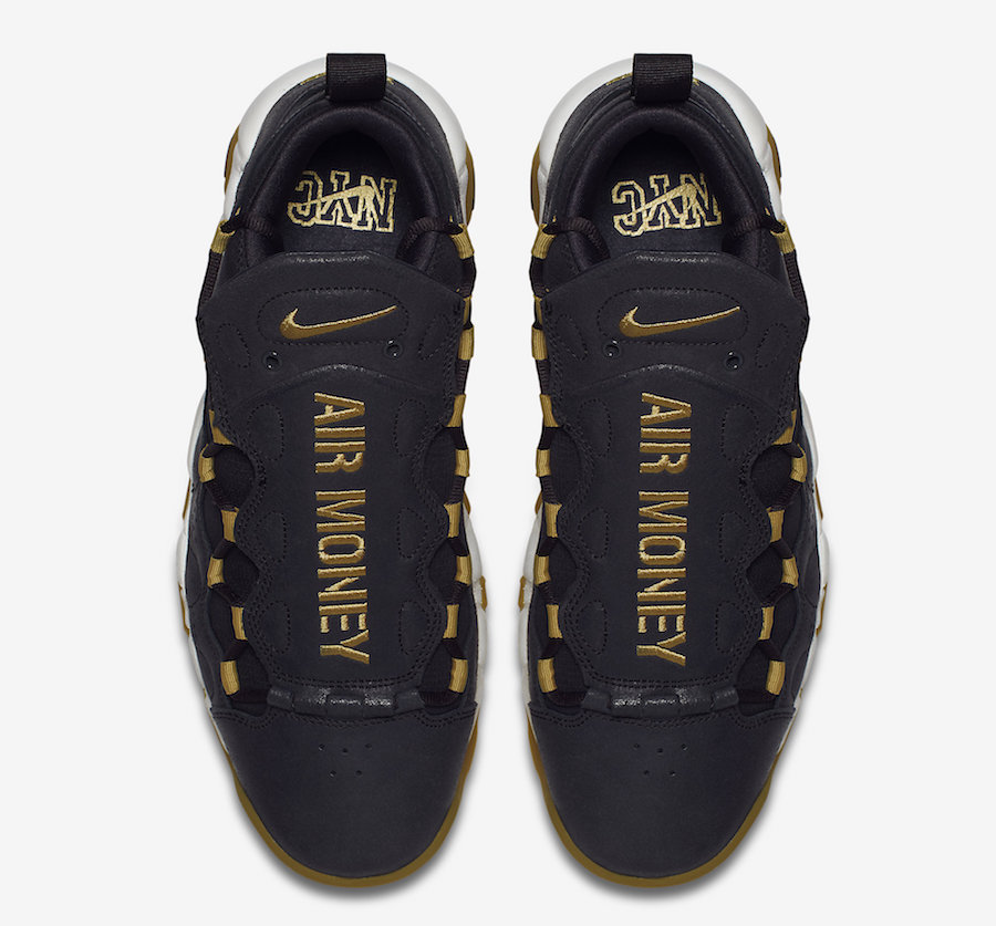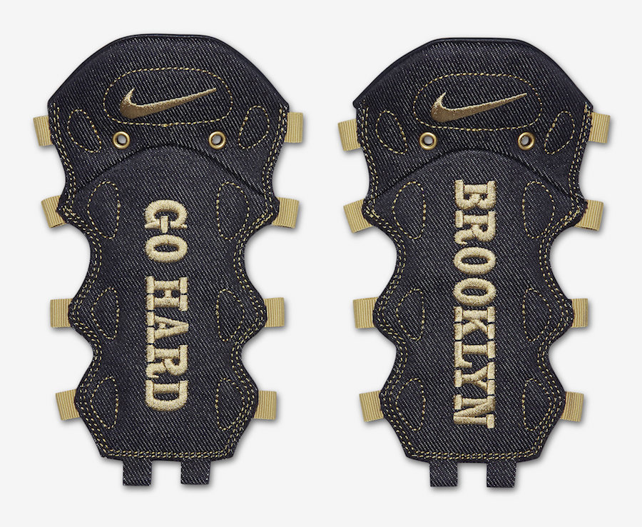 Nike Air More Money 的标志性鞋面,除了标配皮质可更换鞋面,还附送一副特殊鞋面,由牛仔布打造,印有条纹并绣有 “Go Hard”、“Brooklyn” 的金色字体,细节设计诚意满满。
