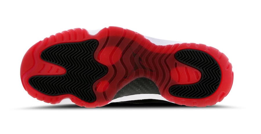 与 AJ11 “Bred” 的设计风格极为接近,黑色、白色、红色加持的鞋身,以及鞋帮上 Air Jordan 的剪影,而鞋身的材质上用牛巴革无缝编织替换掉漆皮 + 网布的设计,极为前卫,鞋底与 AJ11 采用相同的配置及外观,可是说是极其相像了。