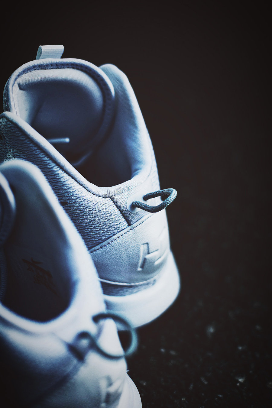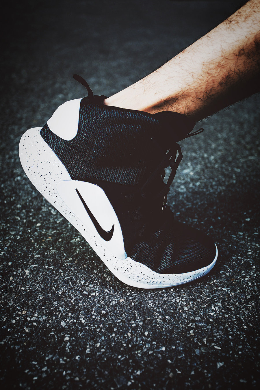 在上脚试穿之后,紧实的包裹性并不会出现压迫感,反而会让双脚觉得很舒适,可以轻松感受到前后掌的 Zoom Air 气垫,高密度的工程网面搭配较宽的外底,在稳定性方面应该会有不俗的表现。在后跟有一定的内收设计,如果在穿着实战中一定要穿高帮球袜。