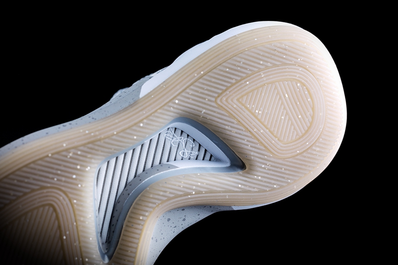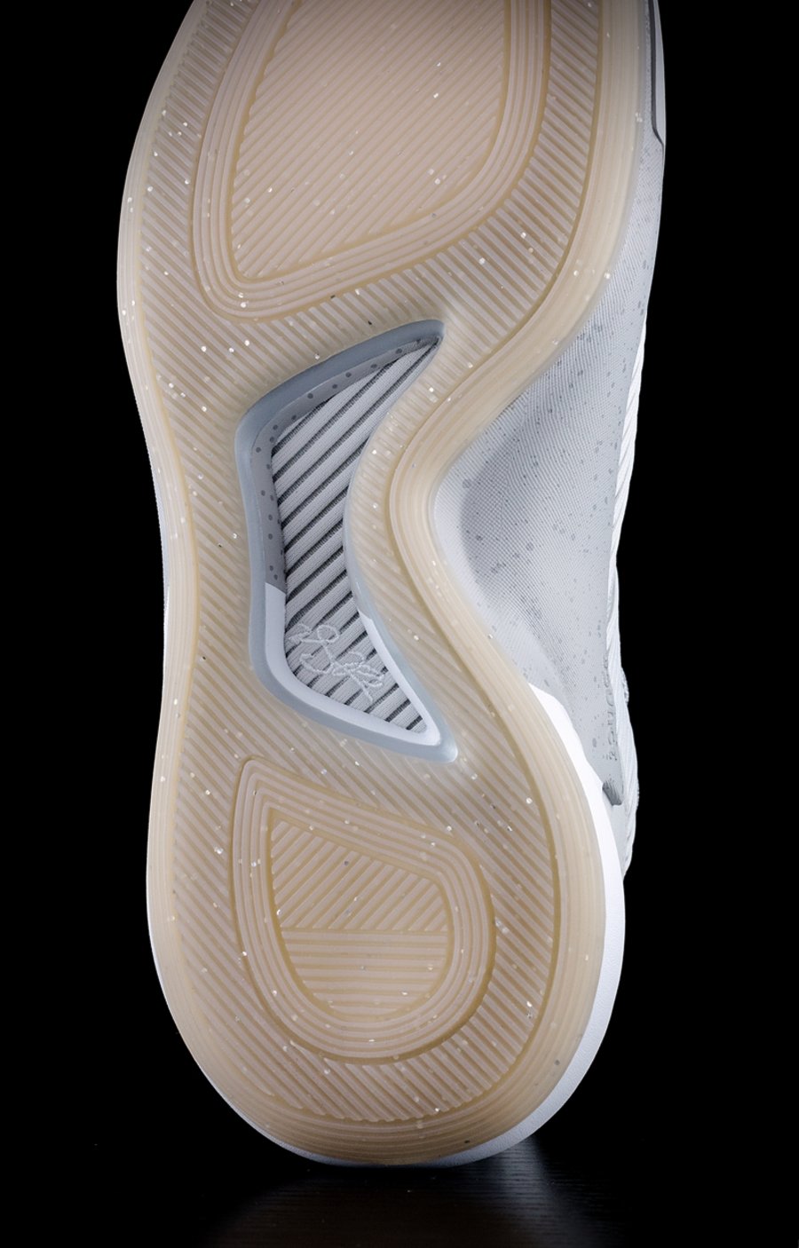 果冻大底掺入金粉,足弓镂空设计,进一步减轻重量。并内嵌抗扭转片,提供最大限度的安全保护,罗斯手写签名也在此处一并彰显。