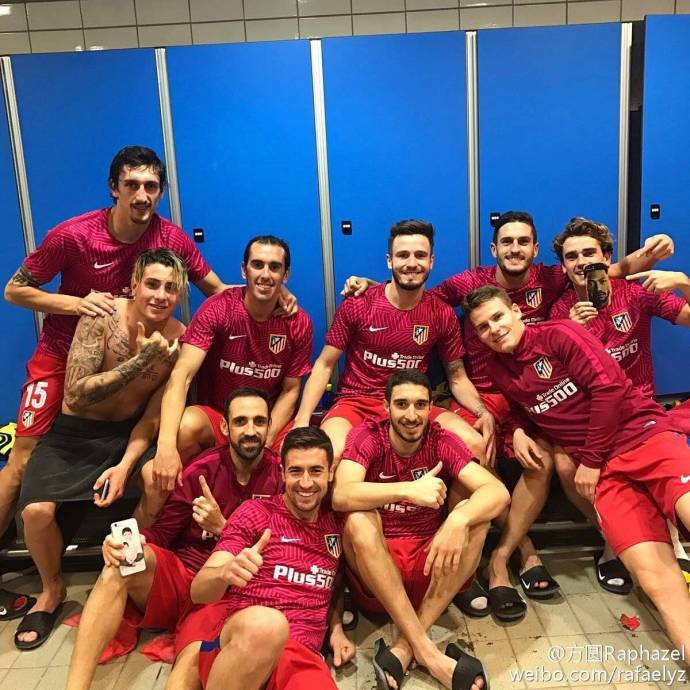 终于,与马竞队友集体合照时,手里不再是那个水杯,