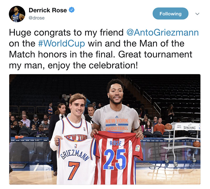 当法国夺冠后,第一时间在个人 Twitter 上 po 出一张与格列兹曼的合影,并送上祝贺!