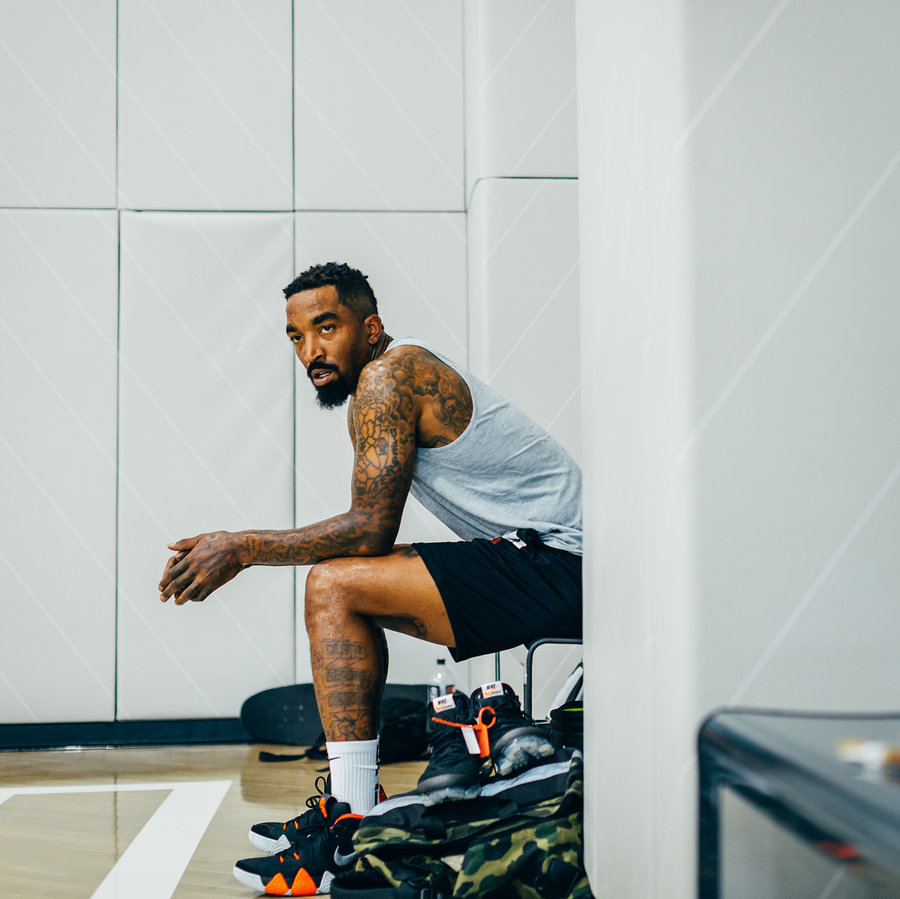 有神经刀之称的骑士球员 J.R. Smith,在上赛季率先上身 Supreme x Nike x NBA Logo 球衣与短裤套装,被不少网友频频转发! 近期,在与安东尼的训练中,被发现右腿小腿上刺上 Supreme 字样,看起来 J.R. Smith 是 Supreme 是真爱!