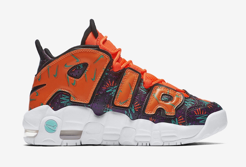 近日,Nike 90 年代的经典鞋款 Air More Uptempo 终于也披上了 “What The” 配色的外衣出现在大家眼前,并命名为 “What The 90s”!整双鞋以招牌性的反转配色呈现,以橙色、青绿色及暗紫色斑纹为基础,并采用富有现代艺术气息的几何图形与 Nike Swoosh 布满鞋身。中底颜色运用纯净的白色形成鲜明反差,突出鞋身主体的复杂配色,使其拥有极其丰富的视觉体验!