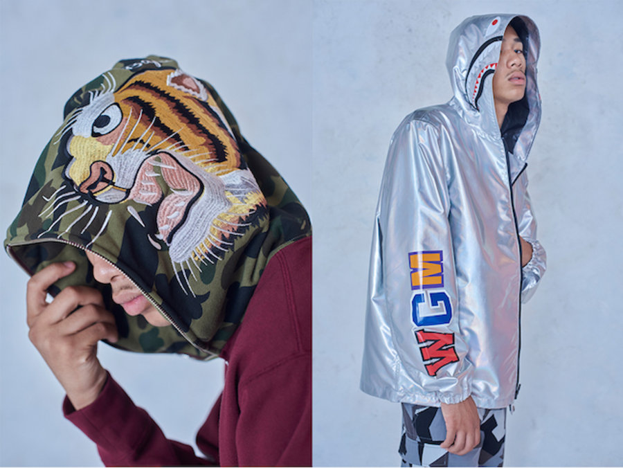 其中迷彩拼接的夹克与 MA-1,锡纸风格的鲨鱼夹克,以及刺绣虎头帽衫都可谓极具吸睛亮点!