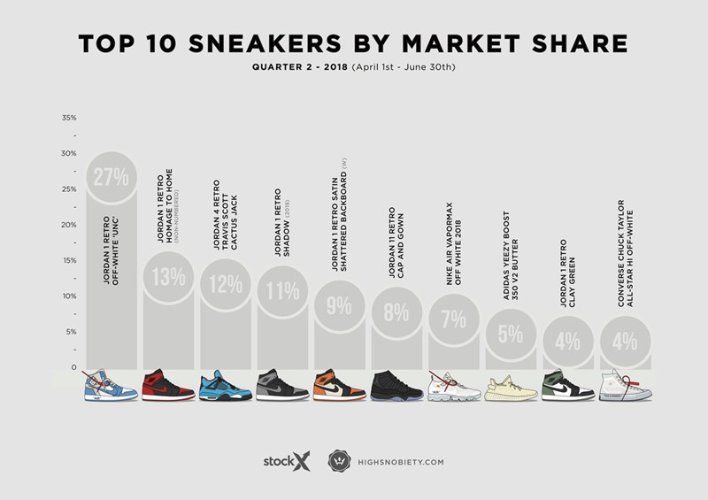 那么当下市场上最贵的球鞋有哪些?我们之前报道的德国著名潮流艺术网站 Highsnobiety 给出了 2018 年第一季度的答案后,近日继续与著名球鞋转卖平台 StockX 带来了 4、5、6 月第二季度的两份球鞋排行榜,分别为最有价值的 10 双球鞋以及最高市场份额的 10 双球鞋。